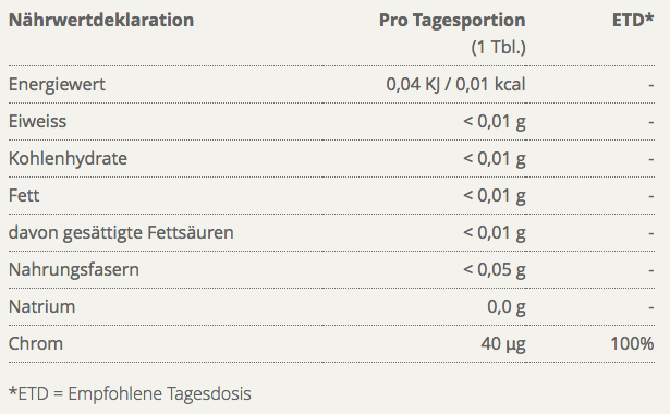 Chrom ist ein lebensnotwendiges Spurenelement, das zur Aufrechterhaltung eines normalen Blutzuckerspiegels beiträgt und einen normalen Stoffwechsel von Makronährstoffen, wie Kohlenhydrate, Fette und Eiweisse, unterstützt.