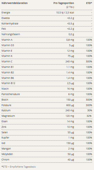 Dicalciumphosphat, Füllstoffe (Cellulose, vernetzte Natriumcarboxymethylcellulose), Vitamin C (L-Ascorbinsäure), Magnesiumoxid, Trennmittel (Mono- und Diglyceride von Speisefettsäuren, Siliciumdioxid, Magnesiumsalz von Speisefettsäuren), Zinkbisglycinat, Überzugmittel (Polydextrose, Hydroxypropylmethylcellulose, Titandioxid, Triglyceride), Vitamin E (Gemischte Tocopherole, D-alpha Tocopherylsäuresuccinat), Eisenfumarat, Magnesiumbisglycinat, Atlantischer Kelp, Calciumbisglycinat, Mangangluconat, Nicotinamid, Vitamin A (Retinylacetat), Kupfergluconat, Calcium-D-pantothenat, Vitamin B6 (Pyridoxal-5-Phosphat), Vitamin D3 (Cholecalciferol), Vitamin B2 (Riboflavin), Vitamin B1 (Thiaminmononitrat), Folsäure (Pteroylglutaminsäure), Chrompicolinat, Biotin, Natriummolybdat, Vitamin K1 (Phyllochinon), Natriumselenat, Vitamin B12 (Cyanocobalamin).