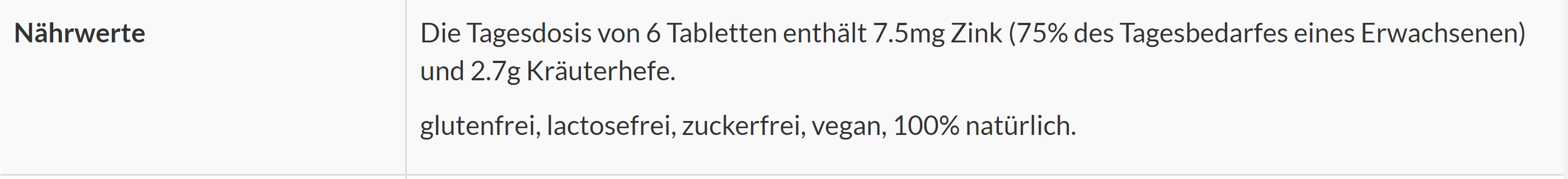 Plasmolysierte Kräuterhefe (88%), Maisstärke, Füllstoffe (mikrokristalline Zellulose), Verdickungsmittel (Pektine), Zinkgluconat, Trennmittel (Siliciumdioxid).
