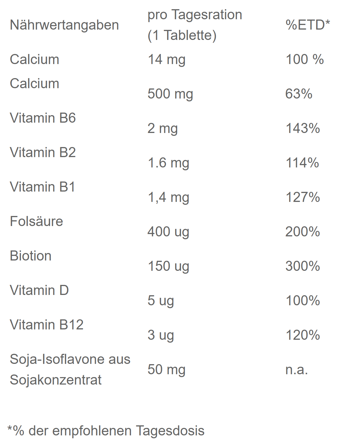 Vitamin B6 trägt zu der Regulierung der Hormontätigkeit und zur herkömmlichen Bildung roter Blutkörperchen bei. Calcium wird für die Erhaltung der Knochen benötigt. Vitamin D trägt zur Calciumaufnahme bei und spielt ebenfalls eine Rolle für den normalen Knochenerhalt. Biotin unterstützt den Erhalt gesunder Haut und Haare. Die B-Vitamine B1, B2, B12 und Biotin tragen zum Energiestoffwechsel und zur einwandfreien Funktion des Nervensystems bei.